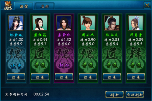 招募界面左下方显示免费刷新时间,每隔一小时可获得一次免费刷新将领的机会;免费次数刷新时,建议立即使用。酒馆每次会随机展示六名将领。若免费次数未恢复,也可消耗仙石或礼券进行刷新。通常手动刷新数次即可能出现蓝色品质以上的散仙;自动刷新功能允许玩家设定期望的将领品质与最大刷新次数。需重点关注散仙的“潜力”与“资质”,这两项属性是衡量其强弱的关键指标。