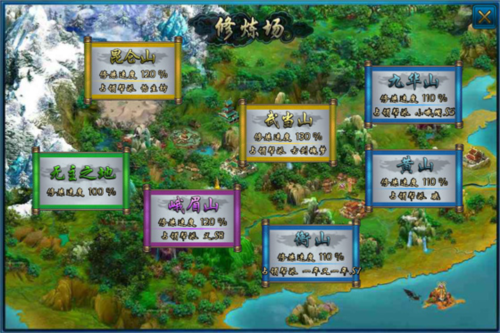 修炼地点共七处:峨眉山、昆仑山、黄山、衡山、武当山、九华山及无主之地;
