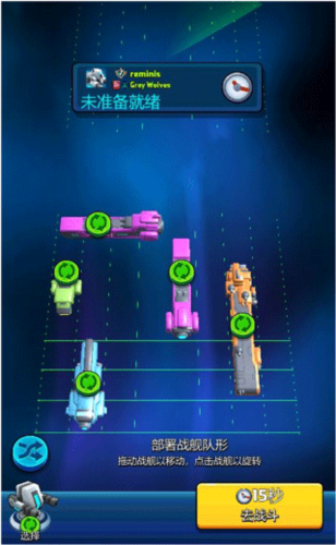 2、匹配成功后进入准备界面,可手动或自动调整战舰阵容;建议手动布置,避免战舰过于密集,否则易被对手集中摧毁。