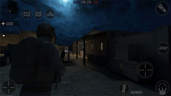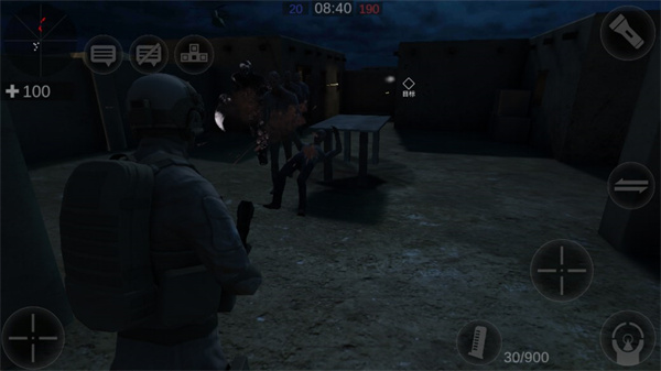 5、游戏内左虚拟摇杆控制移动,右侧按钮负责瞄准射击,右上方可开启手电筒照明。
