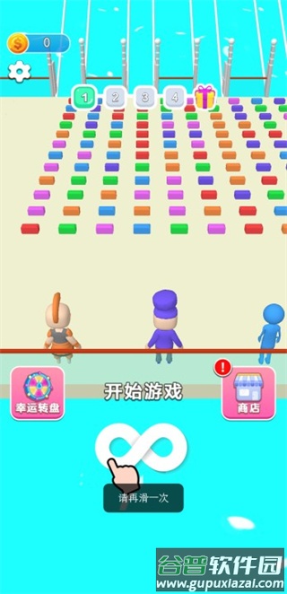 玩家操控角色在砖块赛道上奔跑,收集砖块背在身后。目标是将背负的砖块搭成楼梯,铺满自身颜色的砖块后才能登上楼梯进入下一关。玩法中需兼顾自身搭建进度,同时观察其他玩家动向。既要收集足够砖块,也可在对手楼梯上放置己方砖块,干扰对方进程。