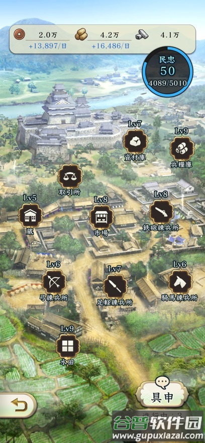 3、每个区域都设有内政设施,扩张领地可提升设施等级上限,从而进行强化。若想重点提升训练步兵的设施,可集中攻占包含该设施的区域。