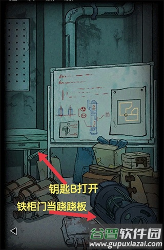 使用锤子击打柜子,获得钥匙B和铁柜门。