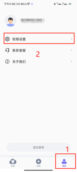 2. 打开电猫云手机应用,进入“我的”页面,找到权限设置选项。