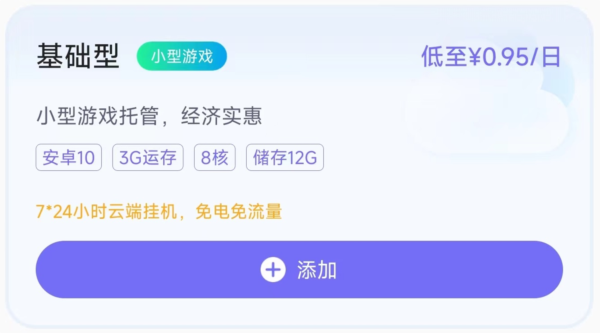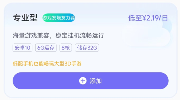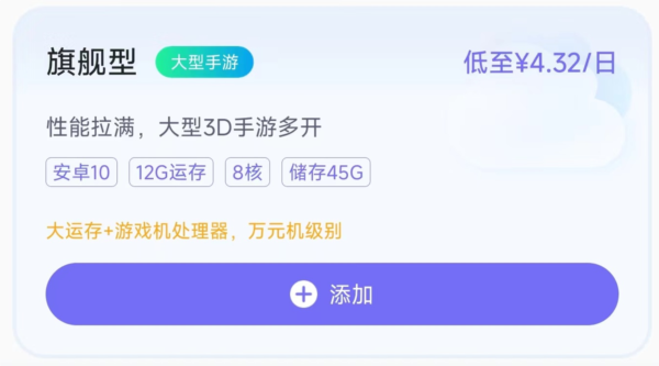 2. 在添加页面中,用户可根据实际需要选择不同套餐,查看对应的云机配置与服务详情。