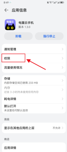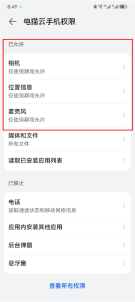 1. 进入手机系统设置,找到应用管理,选择电猫云手机,进入权限管理页面,开启相机、麦克风及位置权限。
