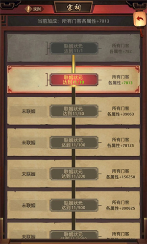 2、宗祠提供的庇佑效果对所有门客生效,子嗣越优秀、联姻越成功,加成越显著。