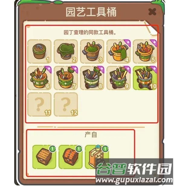 面板上半部分显示“园艺工具桶”共有12级,未点亮图标代表尚未合成;