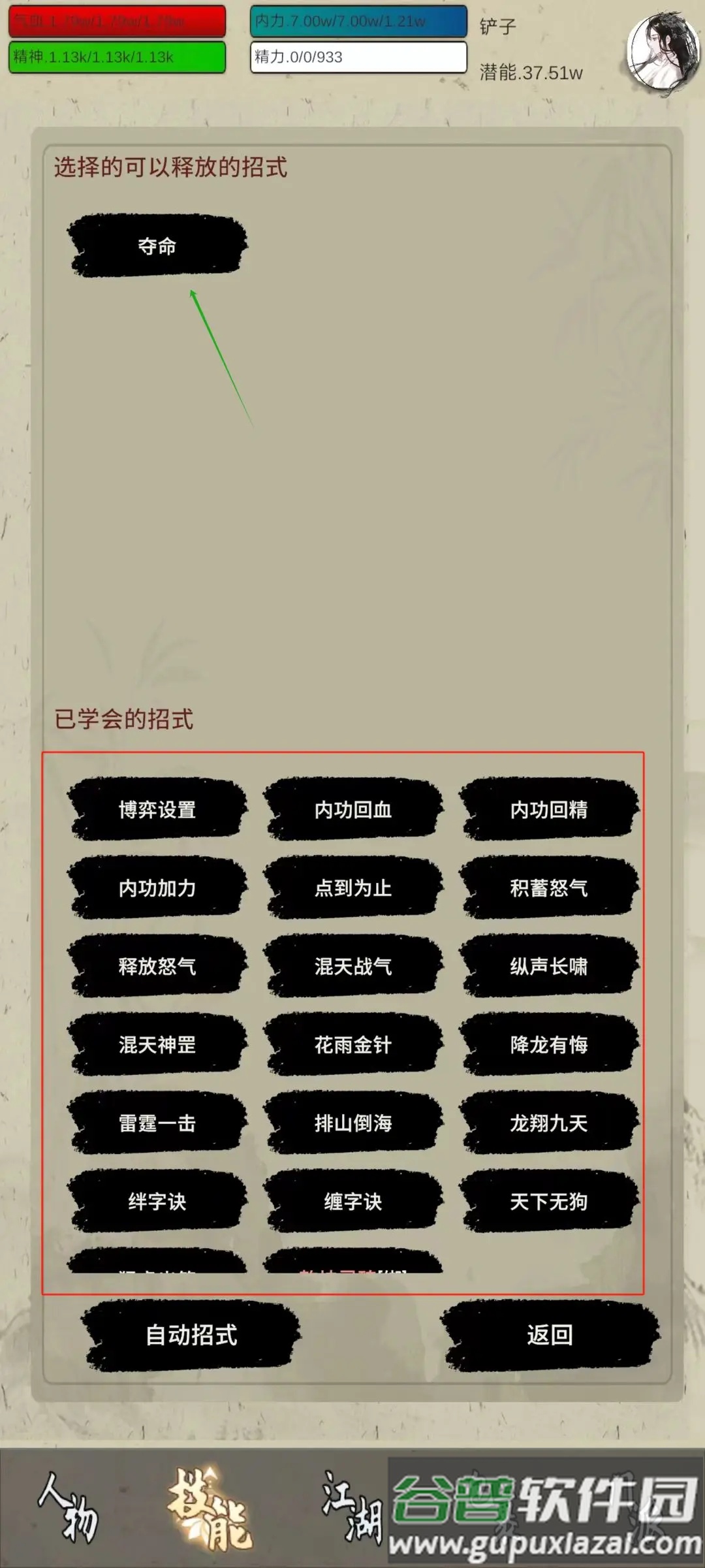 2、进入招式页面后,点击红色方框内已学会招式下方的按钮,招式会移动到上方,如绿色箭头所示;接着点击返回按钮,招式即被保存。