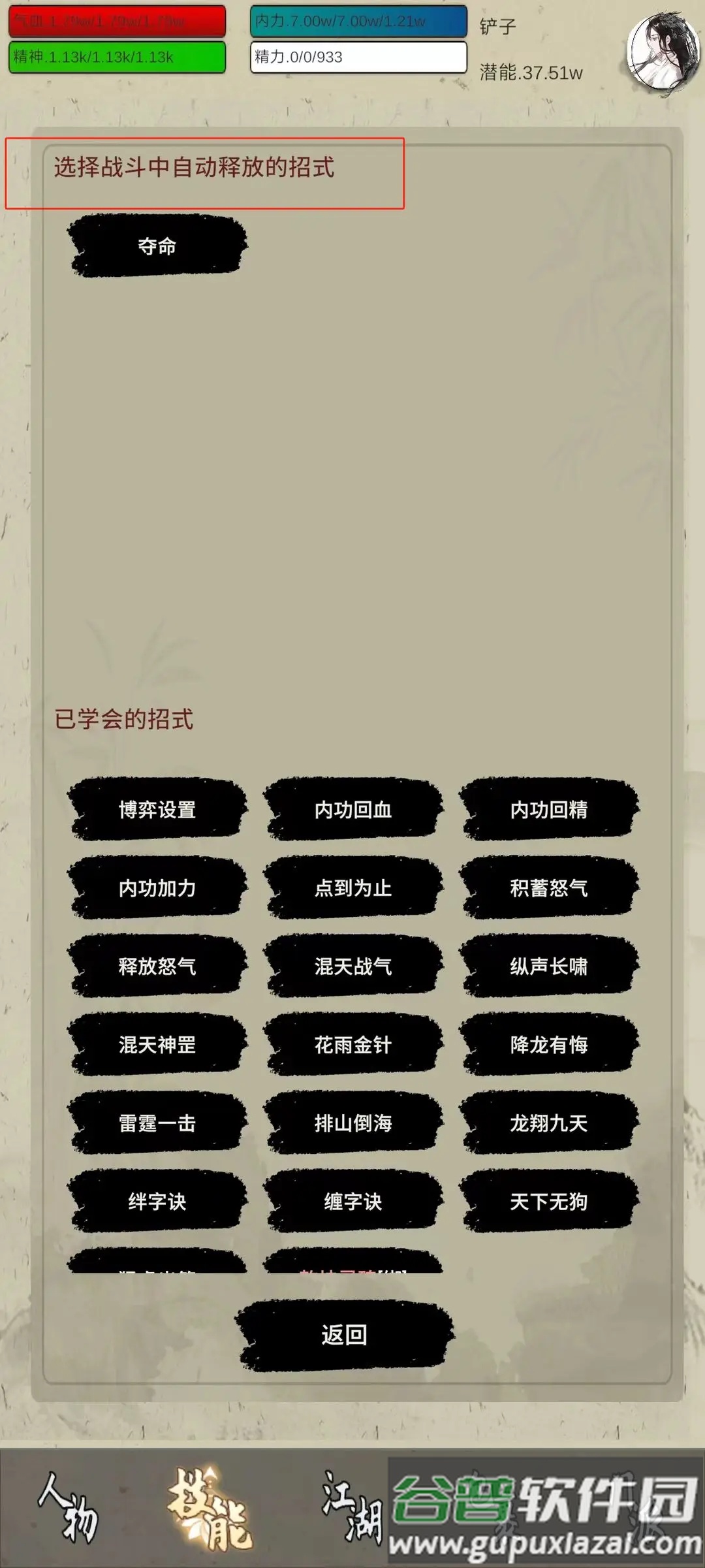 4、若希望招式自动释放,可回到技能页面的招式装配页,点击自动招式;选择一个招式放置到上方,即可在战斗中自动使用。