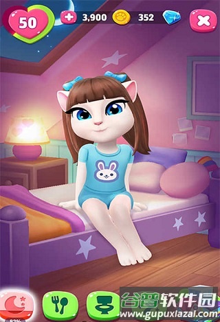 进入游戏,安吉拉会蹦跳着出现并热情打招呼。当安吉拉需要睡眠,即状态图标变黄或红时,点击小床再点床头灯,她就会入睡。
