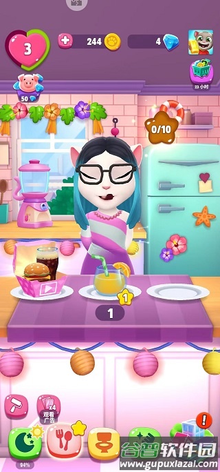 在厨房,点击后方冰箱可购买食物喂给安吉拉。但需注意,餐桌上的饥饿药水不要让她喝,否则饱腹感会归零,吃下的食物也将无效。后方榨汁机若频繁使用会发生爆炸,污渍会溅到屏幕上,需要多次点击才能清理干净。