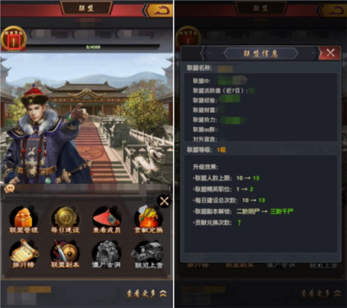 6、僵尸古洞:联盟5级时解锁,可使用联盟财富炼化僵尸,提升副本首领血量上限,从而增加总贡献产出。