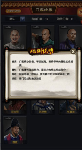 2、每位门客均有其专长领域,所有门客的属性会叠加计算。拥有门客的数量越多、等级越高,玩家的综合实力便越强。