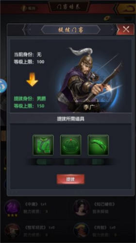 门客达到一定等级后需要提升其身份爵位,才能继续提高等级上限与书籍等级上限。