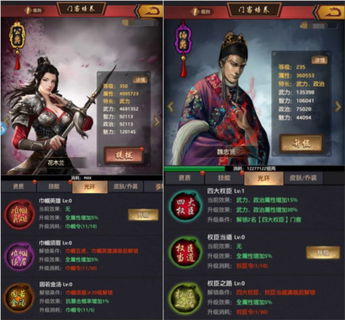 光环分为通用与专属两种;通用光环提升门客全属性,可通过演武堂、一骑当千等玩法获取功勋值进行升级。