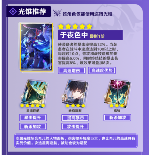 光锥【于夜色中】可提升希儿的暴击率,并依据速度超过100的部分为普攻与战技提供增伤,同时提高终结技的暴击伤害,是高速度希儿的优先选择。