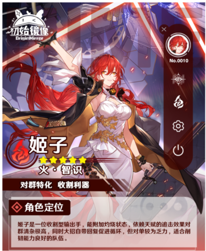 姬子是火属性的智识命途角色,战技可攻击目标及其相邻单位造成火属性伤害;终结技对敌方全体造成高额火属性伤害;秘技可生成持续15秒的灼烧领域,领域内进入战斗有概率使敌人受到的火元素伤害提升。当敌人弱点被击破时,姬子获得充能,充能达到3层会对敌方全体造成火元素伤害。姬子擅长群体输出,配合削韧能力强的角色时清场效率显著。
