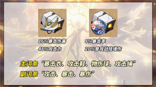 主词条方面,头部与手部固定为生命值与攻击力;躯干选择暴击率或暴击伤害;脚部选择攻击力或速度;位面球选择量子属性伤害加成;连结绳选择攻击力或能量回复效率。