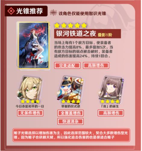 光锥【银河铁道之夜】使姬子在面对多个敌人时获得高额攻击力加成,并在敌人弱点被击破时提供高额增伤,与姬子的天赋联动效果极佳。