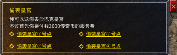 3、进攻方可经由盟重老兵进入影之道,支付2000传奇币偷袭皇宫;偷袭入口对应皇宫东南西北四角,影之道内允许使用召唤令集结队友。