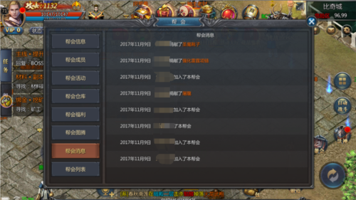帮会消息记录了成员变动、装备兑换等各类日志信息。