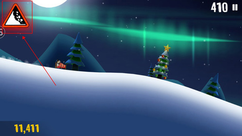 屏幕左上的雪崩警示牌闪烁时,表示雪堆即将逼近。即使已能看到身后雪浪,及时起身加速仍有可能摆脱。