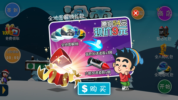 通过收集金币、完成高难动作可填满奖励状态,激活火箭船等高级工具,并能与企鹅、雪怪一同乘坐。