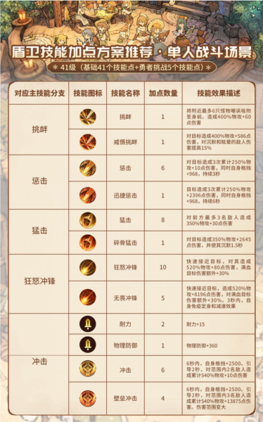 盾卫拥有五个主要技能,根据特点可分为强化输出与强化防御两种方向;下面提供两套技能加点方案供参考。