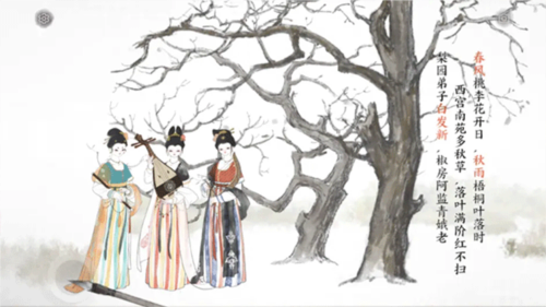 11、四时之景(隐藏):需经历春夏秋冬四季变化;初始枯树为冬,画小花可转为春,画圆圈可转为夏(若无效可在梨园弟子远处画圈),画斜杠转为秋,依次经历后即可解锁;