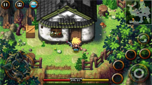 1、基础操作:使用方向键控制移动,动作键负责攻击、对话及选择功能;点击右上角可切换迷你地图与世界地图,左上角按钮则用于打开信息界面、游戏商店或快速保存。