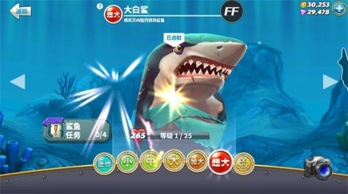 5. 加大号鲨鱼:包含巨口鲨、无沟双髻鲨和凶猛的虎鲨;可以挑战蓝色水母等更危险的生物。