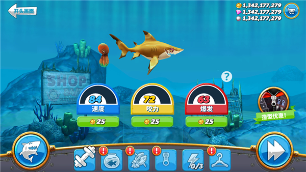 5. 个性化的装备系统:可以为鲨鱼配备各种趣味装备,如耳机、雨伞和喷射背包,这些道具能提升咬合力、游泳速度或提供特殊能力。