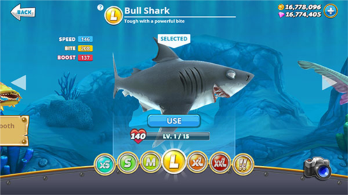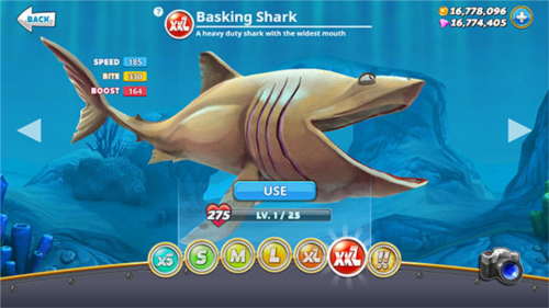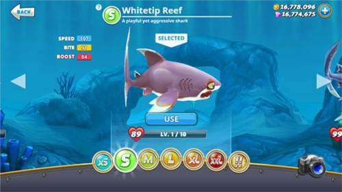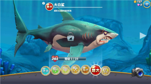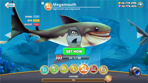 提示:游戏初期鲨鱼最高仅显示至XXL级,但实际上玩家最终可以解锁到!!级的巨齿鲨。