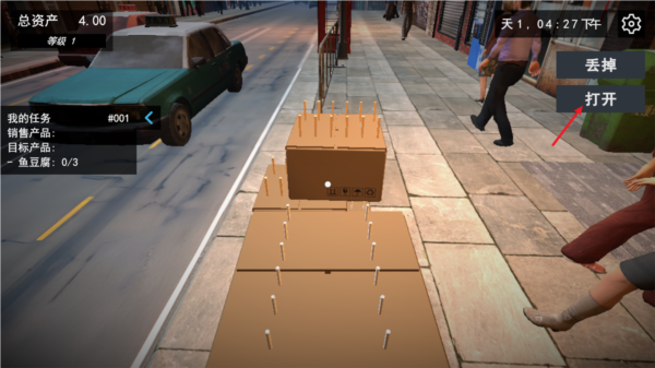 4、下单后稍等片刻,货物会送达门口,点击拾取并打开包装箱。