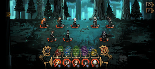 每回合可从两张卡中挑选一张使用;上方显示下回合将获得的卡片。卡片拥有不同属性,相邻角色使用同属性卡时可触发共鸣,通常共鸣层数越高收益越大。