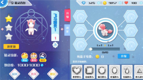 升级:在养成界面选择精灵与经验石,预览升级效果后确认,将消耗金币与经验石。