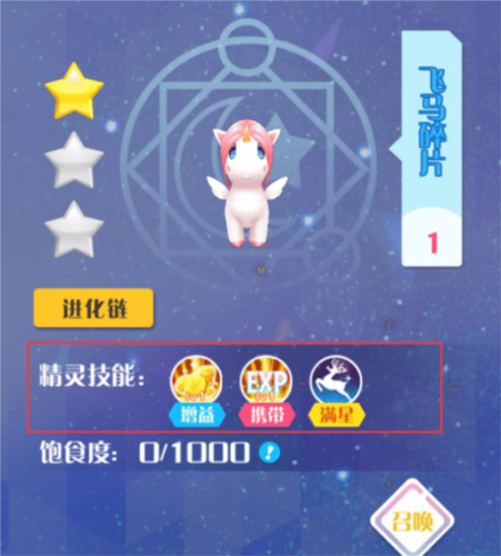 增益技能:被携带的精灵每分钟有概率为玩家提供金币、体力等奖励;饱食度为零时此技能不触发。