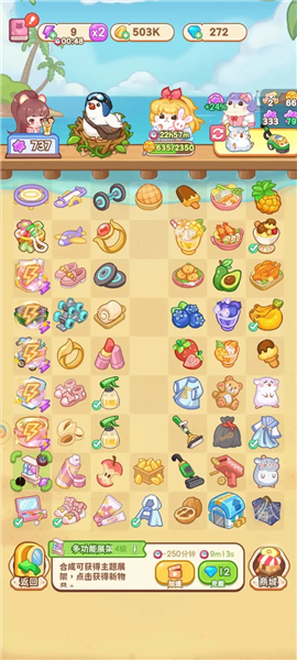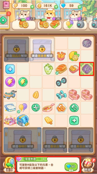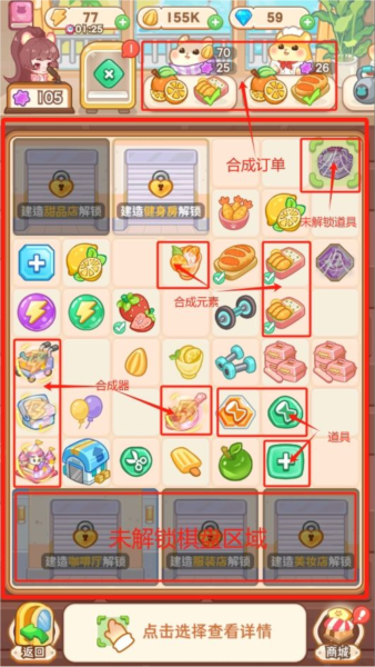 更多道具信息可通过研发图鉴查看;棋盘区域随店铺解锁逐步扩大,最终达7x9规格;未解锁道具所占格子可通过合成相同道具或花费钻石解锁;