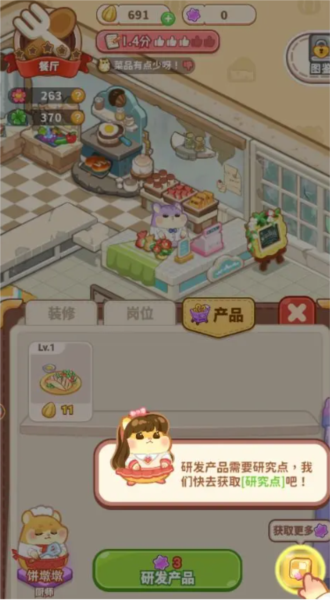 营业一段时间后,需研发新产品以吸引更多顾客;进入店铺点击“产品”,可查看现有商品,点击“研发产品”进入研发界面;