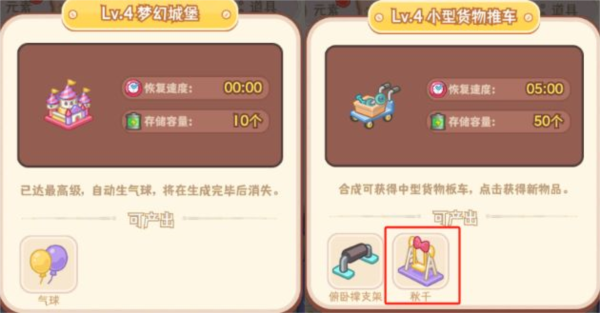 部分合成器需通过其他合成器产出的元素合成获得,例如“梦幻城堡”需由“小型货物推车”生成的“秋千”合成;