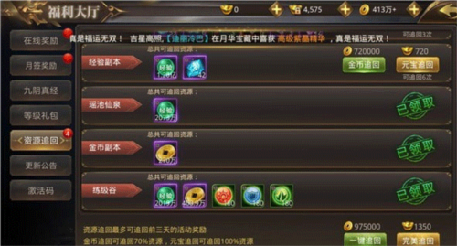 若前一天遗漏部分活动,次日可通过资源追回功能弥补损失;使用元宝可100%追回全部资源,包括经验与材料,也可选择消耗金币追回70%的资源,减少损失。
