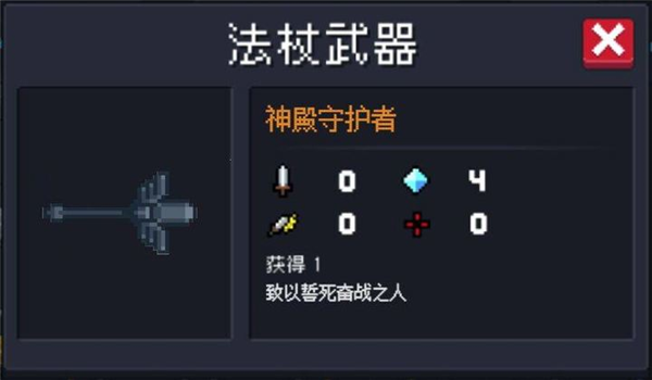 神殿守护者属于橙色法杖,属性为0攻0暴0偏,耗蓝4点。使用后在前方生成五格宽的防护墙,阻挡弹幕并随玩家移动,持续20秒,冷却5秒。