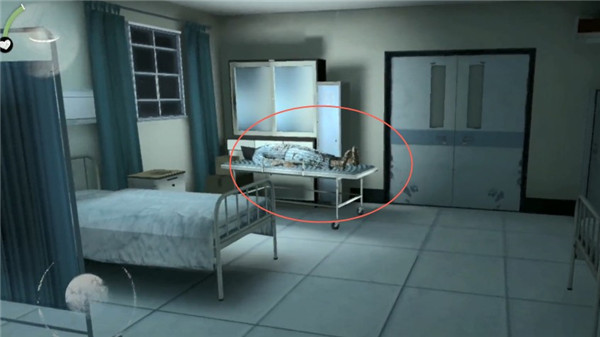 3、手术台取得螺丝,返回走廊从墙洞进入,可在前墙找到医院地图。