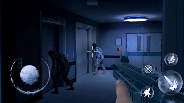 1、开局位于医院,观察环境后走向大门,瞄准并消灭两个小型怪物。