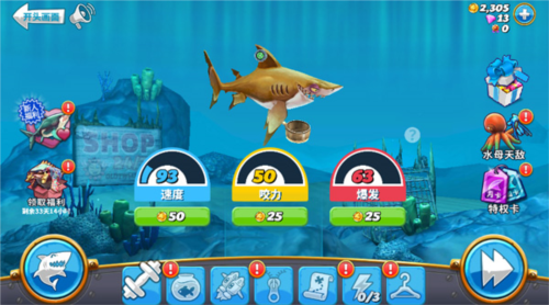 6、鲨鱼的装备升级:利用收集到的资源强化鲨鱼的装备,提升其咬合力、游泳速度等属性,从而增强整体战斗力。