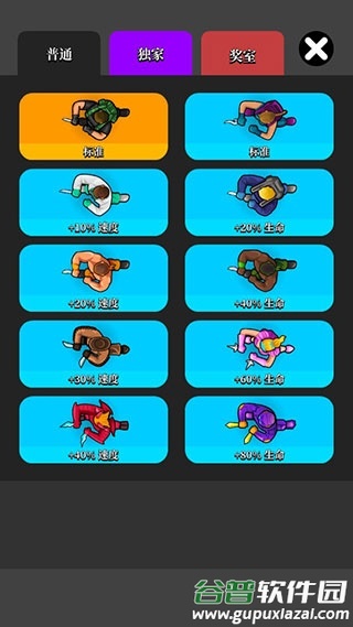 4、游戏内提供不同角色,各自拥有独特属性;按强度区分普通、独家及奖室等级,部分需满足特殊条件才能解锁。