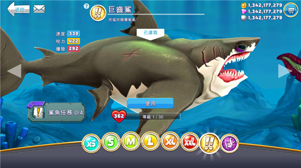 1、鲨鱼解锁途径包括直接钻石购买,或积满进度条后用金币兑换,初始可见最高为XXL级,实际存在隐藏的巨齿鲨等级。