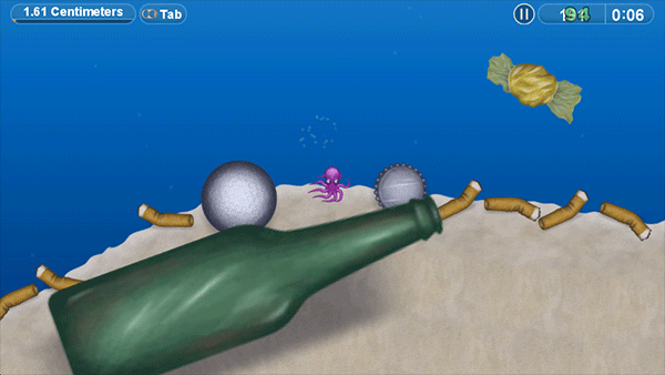 4、操控小章鱼移动并吃掉场景中的垃圾,所用时间越短,最终的评价等级就越高。