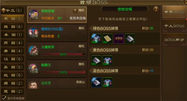 世界BOSS是日常玩法核心,分为国家首领与中立区首领两类。